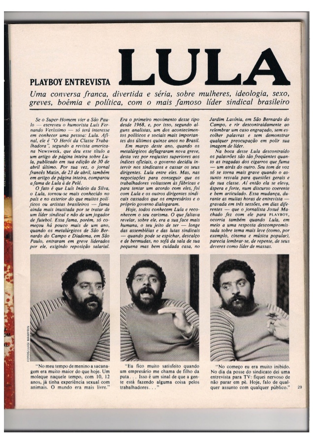 Quando refletimos sobre a crise que o país vive hoje, é sempre bom relembrar da entrevista de Lula concedida a revista Play Boy em 1979 onde fica claro o seu desvio de caráter ao demonstrar ser um homem inescrupuloso, sádico e pervertido.